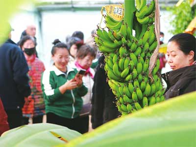 近日,忻州市忻府区光子农业合作社蔬菜大棚示范园区内,游客正在观赏热带植物。该园区引进种植香蕉等热带植物,形成了集观光农业、农耕体验、教学科研为一体的多功能现代化农业园区,解锁冬季观光旅游消费新场景。