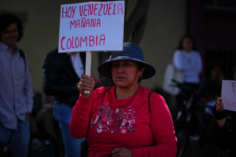 1月3日,在哥伦比亚首都波哥大的美国驻哥伦比亚大使馆外,一名妇女打出“特朗普别染指拉丁美洲”的抗议标语。