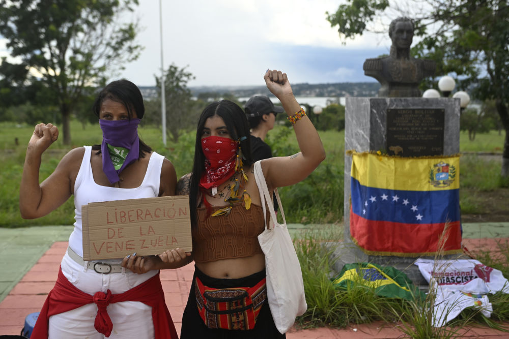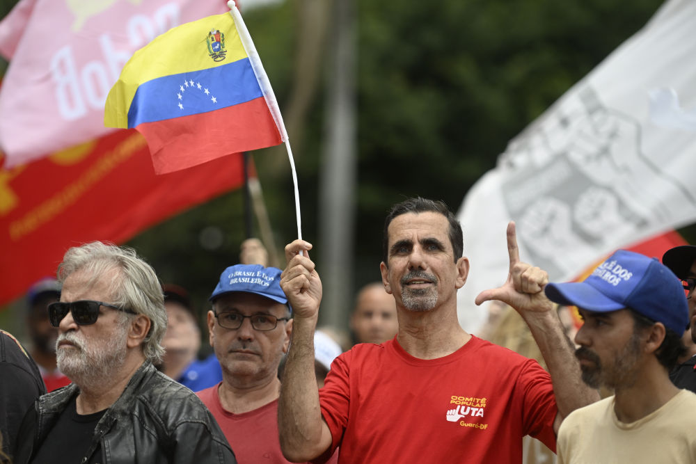 1月3日,巴西民众在首都巴西利亚的委内瑞拉驻巴西大使馆外参加活动,抗议美国的军事行动。