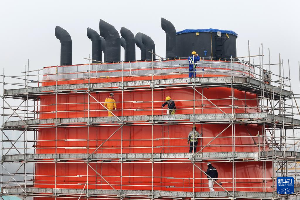 1月4日,在山东烟台黄渤海新区一家造船企业,工作人员对一座大型船舶的船体模块进行质量检查(无人机照片)。