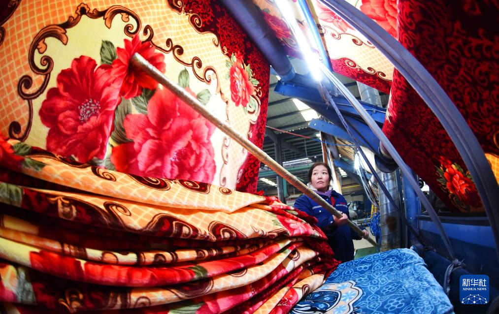 1月4日,在江苏省连云港高新区海州工业园一家企业生产车间,工人在毛毯生产线上忙碌。