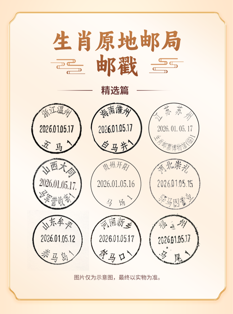 值得一提的是,中国邮政此前公布2026丙午年生肖原地邮局名单,山西大同马军营邮政所成功入选。丙午年原地封,已于2025年12月29日完成订购登记。山西的集邮爱好者可携带已订购的原地封,前往这一原地邮局加盖相关邮戳,制作并寄出原地首日实寄封,这类承载生肖文化与邮政印记的实寄封,兼具纪念意义与收藏价值。另外,山西7枚单色文化日戳,也于邮票发行当日同步启用。