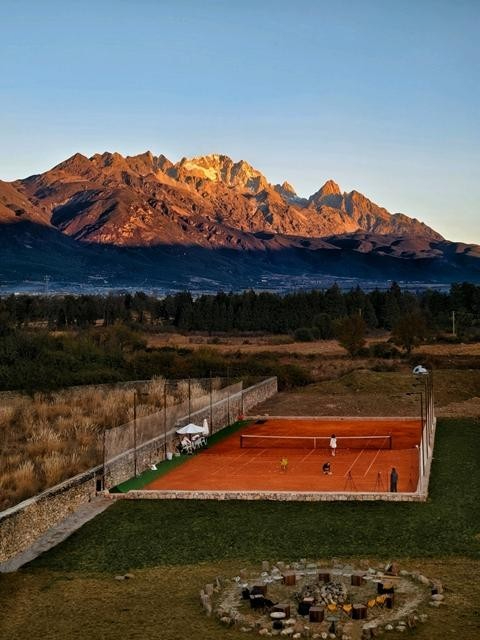 宋筱超在玉龙雪山下建的红土网球场,打球时可以看到“日照金山”的景观。受访者供图