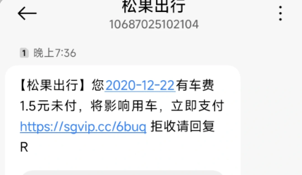 “在收到这个短信前,我都不知道有松果出行,怎么会有一个未支付订单?听人说订单是可以伪造的。”在收到短信后,这名江苏网友称,这可能是新型诈骗手段。“这个小程序确实很奇怪,这么多年了才发消息,以前也不告诉我。”一位广东网友称也收到了同样的短信,显示2020年10月31日有车费1.5元未付。该网友称,自己不敢直接点链接进去,担心是诈骗,后来通过微信搜小程序进去看了下,发现应该是扣松果出行余额里的钱,自己余额当时没钱,显示松果出行帮垫付了。