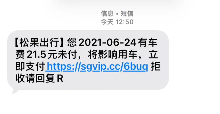 扬子晚报网1月6日讯(记者 郭一鹏) 近日,有江苏网友在社交平台上发帖称,莫名其妙收到一个“松果出行”的短信,称其2021年6月24日有车费21.4元未支付,提醒立即支付否则会影响用车。该网友觉得像诈骗信息,因为在她的印象中未使用过“松果出行”。