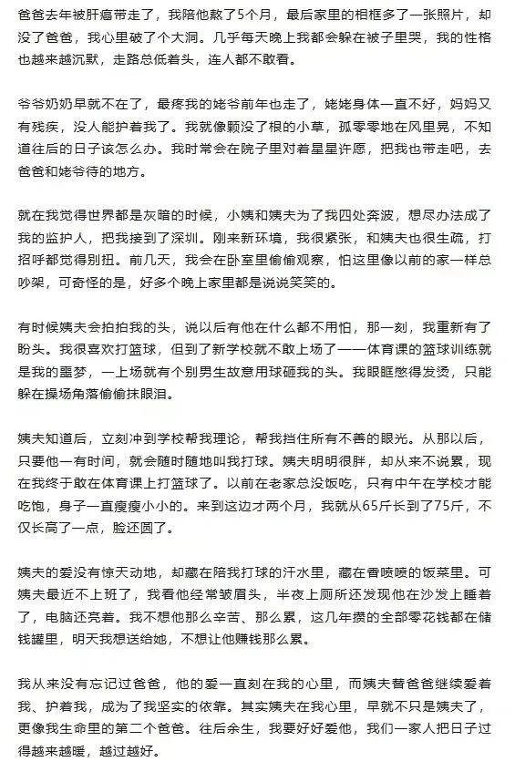 更动人的是这份爱的双向奔赴。佳佳将姨父的付出看在眼里、记在心里,不仅在作文里写下“你是我的第二个爸爸”,还拿出攒了几年的1312.6元零花钱,心疼失业的姨父。孩童的纯粹感恩,与成人的无私守护相互映照,构成了最温暖的情感闭环。这让我们意识到,亲情的本质从来不是单向的给予,而是彼此的珍惜与回应。哪怕没有血脉的牵绊,真诚的付出也能浇灌出最真挚的情感之花。