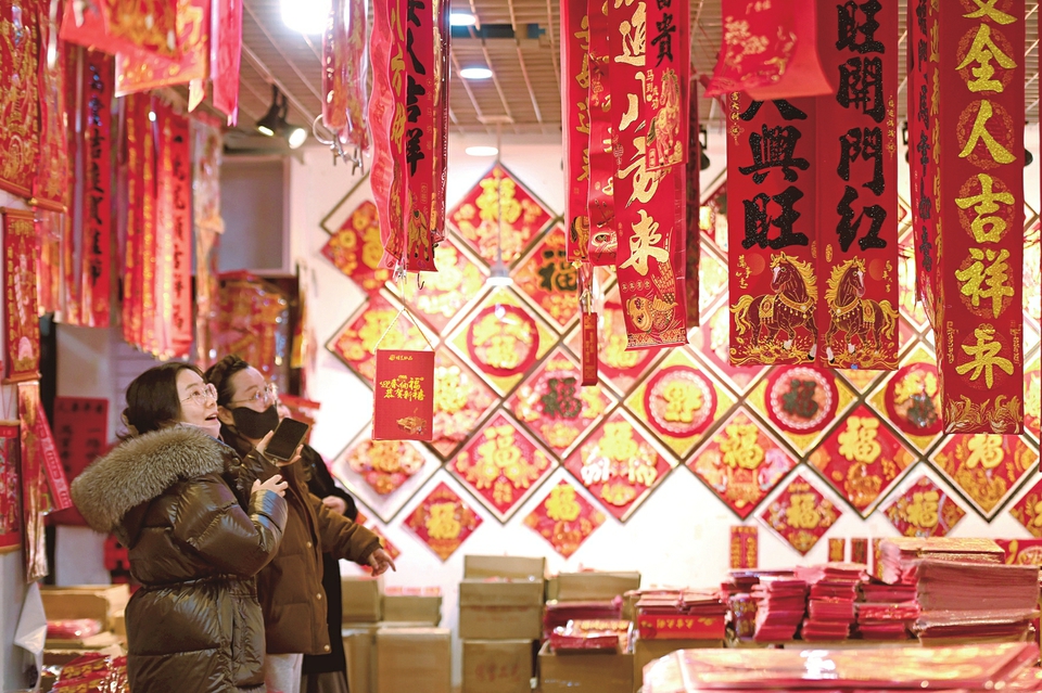 1月6日,太原市尖草坪区小商品批发市场内年味渐浓,春联、福字、生肖饰品等年货琳琅满目。图为市民正在进行选购。