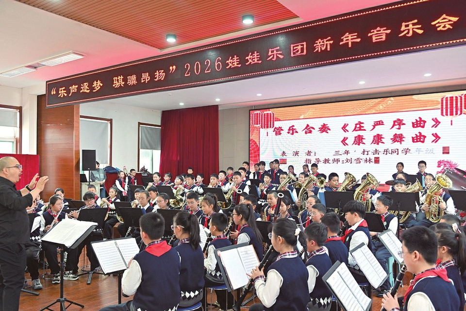 1月7日,太原市迎泽区海边街小学举办“乐声逐梦 骐骥昂扬”2026娃娃乐团新年音乐会。活动现场,小团员们倾情演绎管弦乐作品,悠扬旋律奏响新年祝福,生动展现了该校美育教育成果与少年的蓬勃朝气。