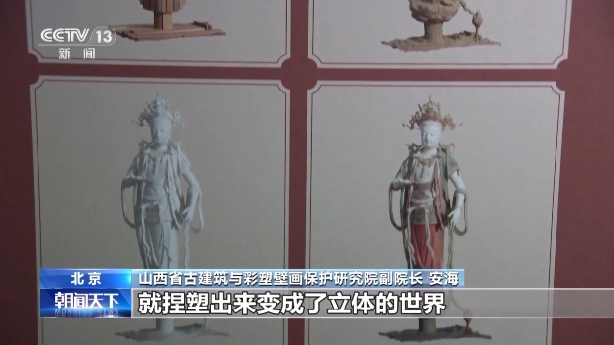 山西省古建筑与彩塑壁画保护研究院副院长 安海:悬塑都是木骨为胎,上面敷泥,泥上敷彩色的颜料层,画塑一体,首先是有画,壁画发展到一定程度以后出现了彩塑,把画中的这些所有立体的人物就捏塑出来变成了立体世界,明代又出现了悬塑,是历朝历代艺术积累的一种突破。