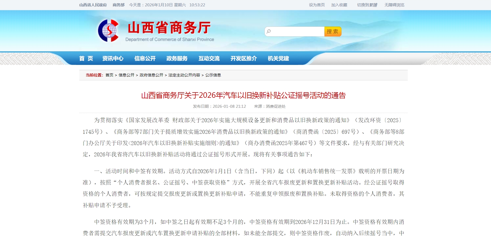 山西新闻网讯(记者 李卓馨)1月9日,山西省2026年汽车以旧换新补贴活动报名正式开启。省商务厅发布通告明确,本年度补贴活动首次采用公证摇号发放资格,覆盖报废更新和置换更新两大类别,首轮摇号1月19日举行,未中签者无需重复报名,自动进入后续轮次。