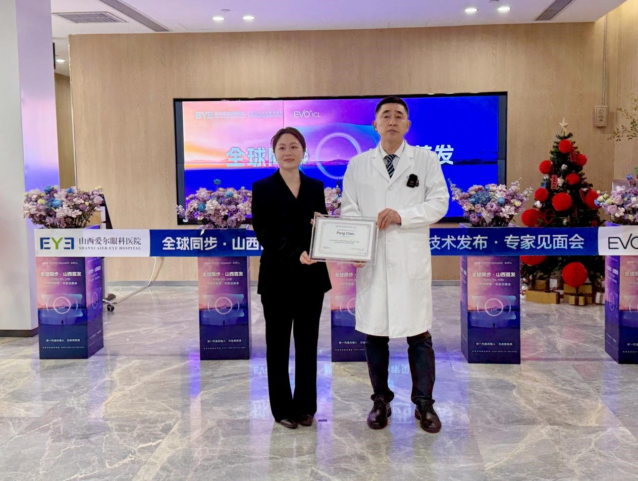 手术的成功实施,离不开专家的深厚积淀。本次手术由山西爱尔眼科医院副院长、屈光学科带头人陈鹏亲自主刀。陈鹏院长不仅是国内知名的屈光手术专家,拥有超过13万例的丰富临床经验(其中ICL手术量超25000例),其在此项新技术领域的探索与实践也早已开始。早在2022年8月,他就在海南博鳌乐城为山西患者完成了EVO+ ICL (V5)晶体植入手术。截至目前,陈鹏已累计完成14例EVO+ ICL (V5)晶体植入手术,成为山西开展此项手术多且经验丰富的专家。在近日于上海举行的2026“海上之光”学术盛会上,他荣膺“EVO ICL临床贡献奖”及“中国首批EVO+ ICL (V5)临床应用专家”权威认证,其技术实力与引领地位获得了全国范围的认可。
