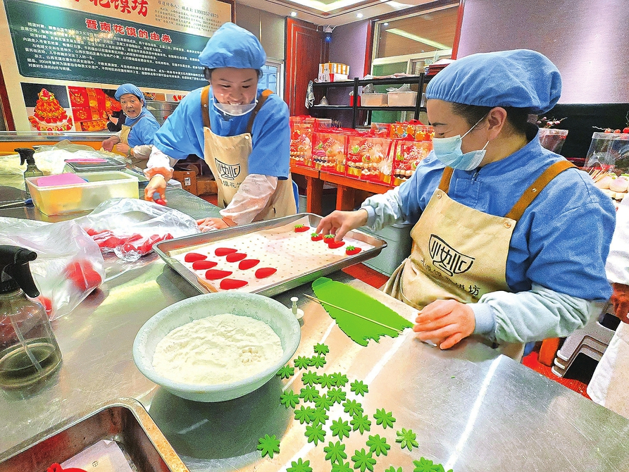 1月11日,尧馍馍花馍非遗工坊内,工人师傅们正在制作手工艺术花馍。作为“三晋老字号”项目,该工坊保留手工定型等传统技艺,并借助电商平台销往全国。