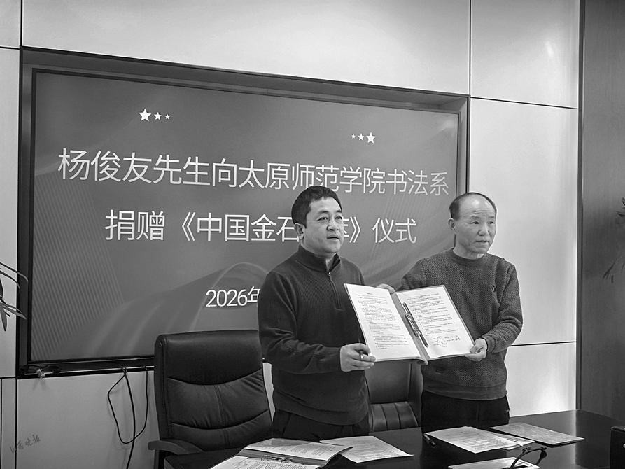 山西晚报·山河+讯(记者 孙佳森)1月13日,太原师范学院举行了一场捐赠仪式,著名收藏家杨俊友先生将一套珍贵的金石拓片文献《中国金石集萃》捐赠给该校书法系。这套文献是杨俊友先生十余年前从日本“抢救”回来的。捐赠仪式上,太原师范学院与杨俊友先生签署捐赠协议,并现场颁发特聘教授证书。