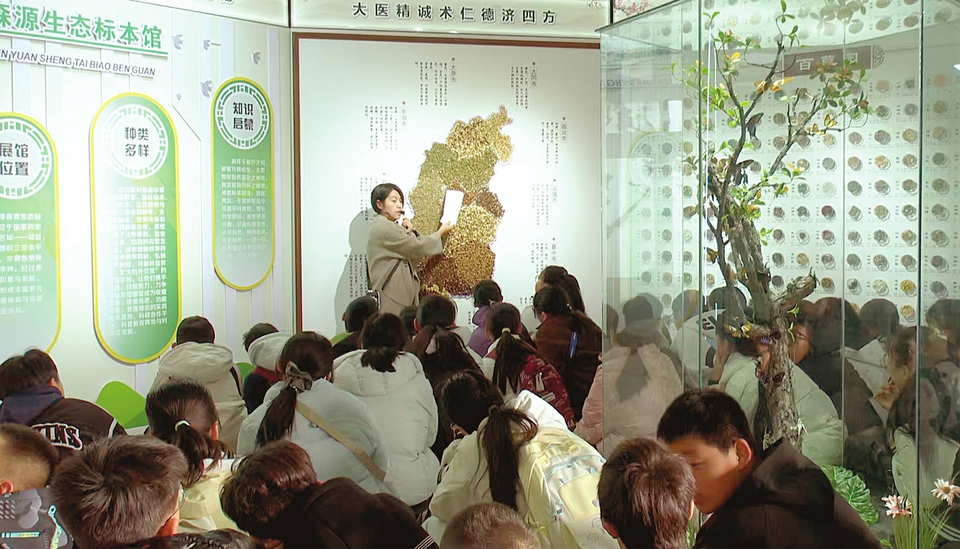 1月11日上午,祁县绿森源生态标本馆内药香弥漫。一幅用黄芪、连翘、党参等道地药材拼贴而成的山西地图前,围拢着20多名聚精会神的中学生。