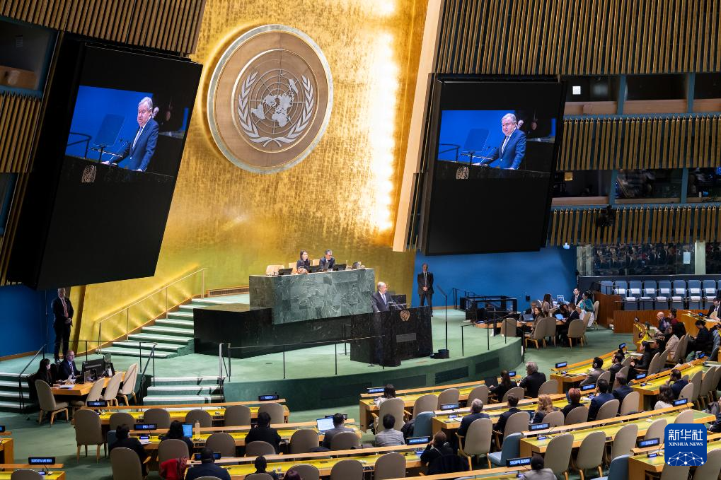1月15日,在位于纽约的联合国总部,联合国秘书长古特雷斯(中)在联大全体会议上通报今年工作重点。