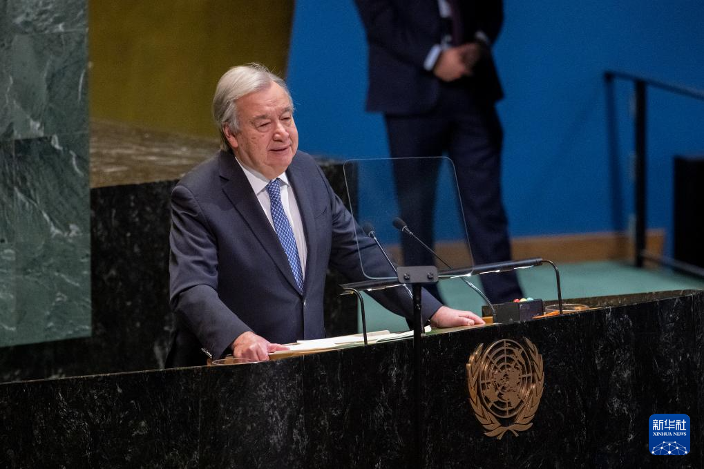 1月15日,在位于纽约的联合国总部,联合国秘书长古特雷斯在联大全体会议上通报今年工作重点。
