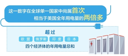 这一数字在全球单一国家中尚属首次,相当于美国全年用电量的两倍多,超过欧盟、俄罗斯、印度、日本四个经济体的年用电量总和。