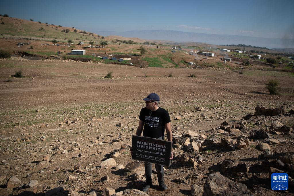 1月16日,在约旦河西岸拉斯艾因奥贾村,以色列和平组织成员举行集会,抗议以色列犹太定居者的暴力行为。