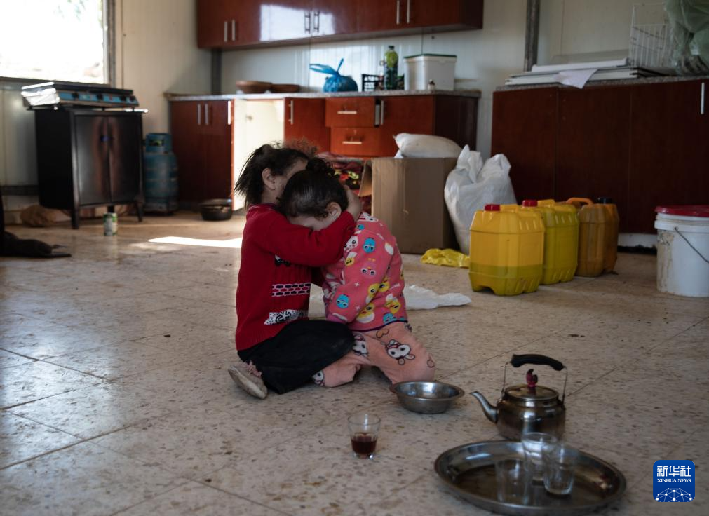 1月16日,在约旦河西岸拉斯艾因奥贾村,一对贝都因姐妹在即将搬离的家中拥抱。