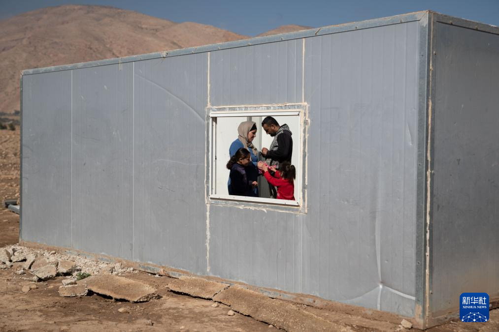 1月16日,在约旦河西岸拉斯艾因奥贾村,一个贝都因人家庭在即将搬离的家中分享糖果。