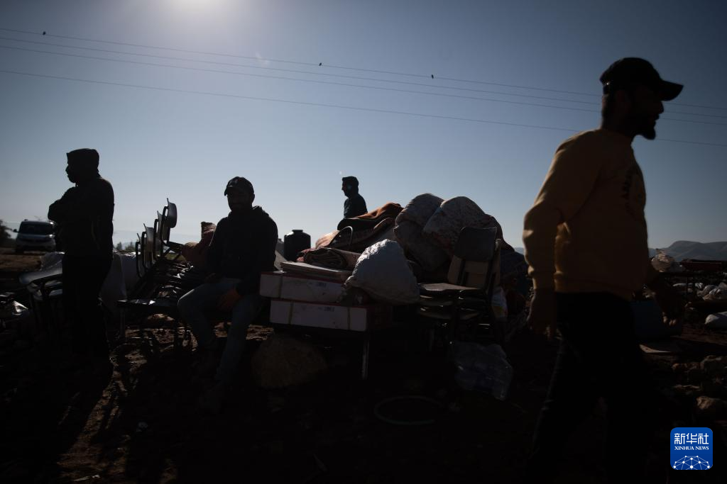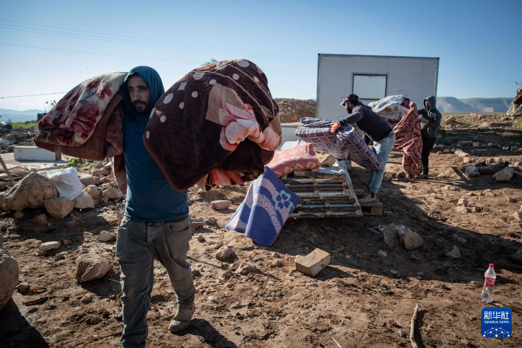 1月16日,在约旦河西岸拉斯艾因奥贾村,一个贝都因人家庭收拾准备搬走的被褥。