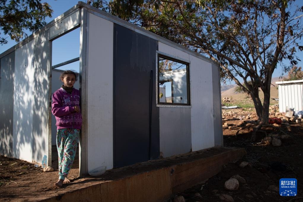 1月16日,在约旦河西岸拉斯艾因奥贾村,一名贝都因女孩站在清空的家门口。