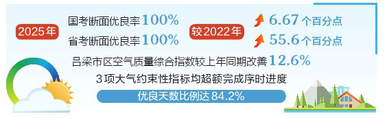 此外,吕梁扎实推进大气污染防治各项工作,各项核心指标表现亮眼。2025年,吕梁市区空气质量综合指数较上年同期改善12.6%;3项大气约束性指标均超额完成序时进度,其中PM2.5平均浓度降至24微克/立方米,同比下降22.6%,持续保持全省前列、汾渭平原第一;优良天数比例达84.2%,同比增加6.7个百分点,重污染天数为0;6项污染物实现五降一平。目前,8户在产钢铁企业完成超低排放改造,34户焦化生产企业完成特别排放限值改造,淘汰4.3米焦化企业7户。
