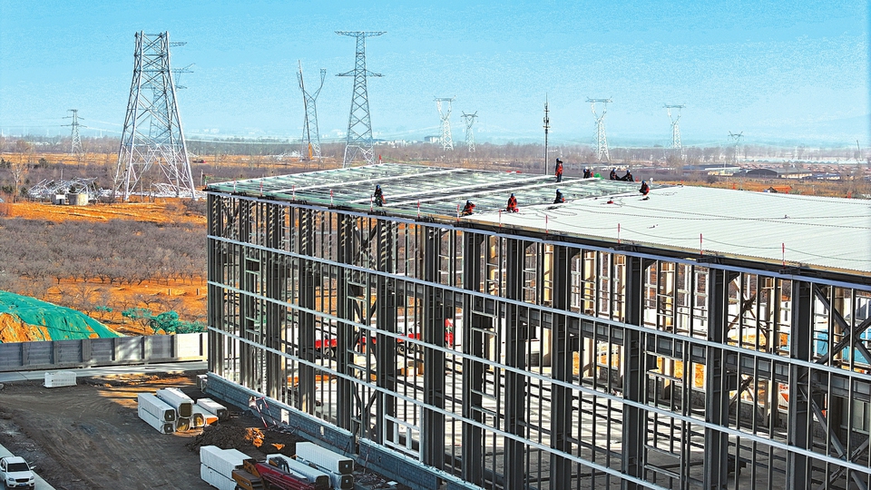 1月15日,大同—天津南1000千伏特高压交流工程大同1000千伏变电站建设现场,施工人员正在进行1000千伏GIS室屋面底板安装作业。目前该工程土建施工已完成70%,电气安装工程同步推进至17%。