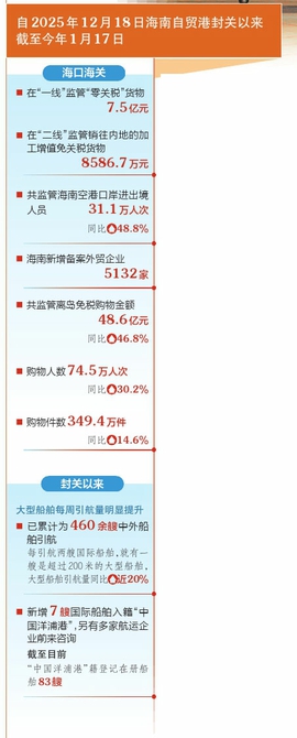 据海口海关统计,自2025年12月18日封关以来截至1月17日,海口海关在“一线”监管“零关税”货物7.5亿元,在“二线”监管销往内地的加工增值免关税货物8586.7万元。