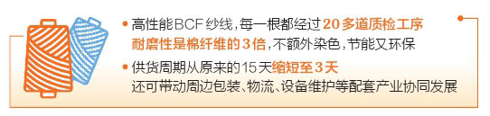 车间主任周国平介绍,该项目研发并生产的高性能BCF纱线,每一根都经过20多道质检工序,成品像棉纤维一样亲肤,但耐磨性是棉纤维的3倍,不额外染色,节能又环保。