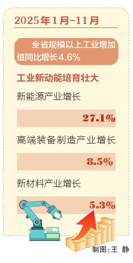 数据显示,2025年1月—11月,全省规模以上工业增加值同比增长4.6%,工业新动能培育壮大,新能源产业增长27.1%,高端装备制造产业增长8.5%,新材料产业增长5.3%,为全省经济发展提供了坚实支撑。
