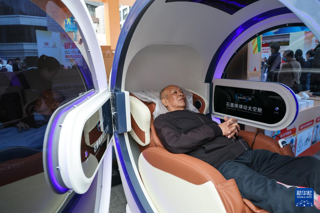 1月21日,在深圳市罗湖区的银发消费品牌体验展区,一位老人体验智慧康养产品。