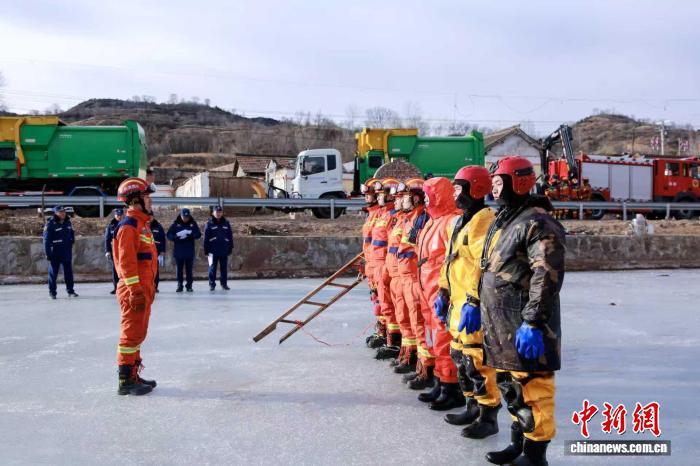本次演练地点为左权县林河村,模拟场景为该村附近水面冰层破裂,有游客落水被困。消防救援人员到场后,首先进行冰面探测。