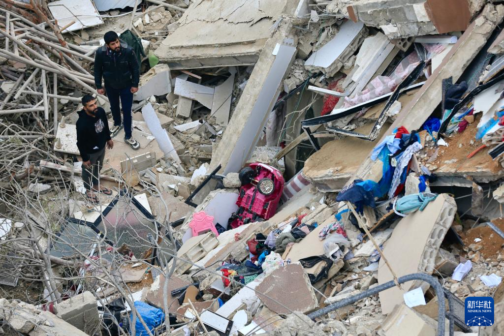 1月22日,在黎巴嫩南部盖纳里特镇,当地居民查看空袭后的受损情况。