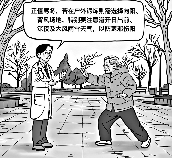 正值寒冬,中国中医科学院医学实验中心研究员代金刚建议,练习最好在室内,微汗即止;若在户外锻炼则需选择向阳、背风场地,特别要注意避开日出前、深夜及大风雨雪天气,以防寒邪伤阳。