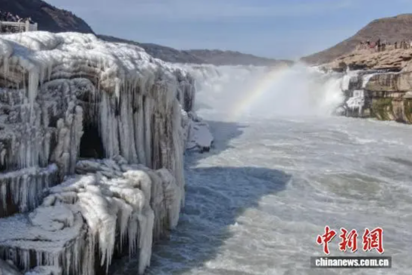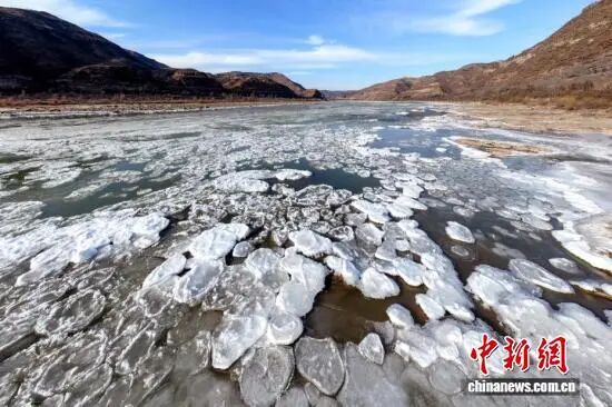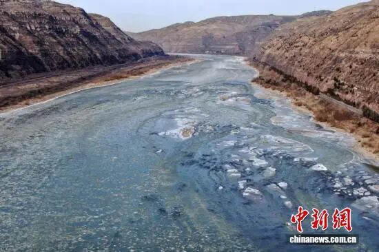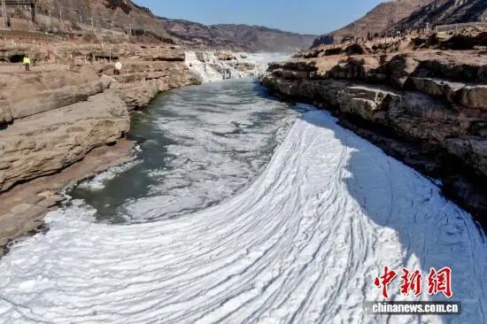 1月21日,山西吉县黄河壶口瀑布下游十里龙槽出现流凌封河景观。近日,受持续降温天气影响,黄河晋陕峡谷流凌密度持续增大,在黄河壶口瀑布下游十里龙槽堆积凝结,形成入冬以来首次流凌封河景观。吕桂明摄(无人机照片)