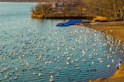 1月13日,芮城县圣天湖景区,成群的白天鹅沐浴在晨光里,与湖光山色构成诗情画意的美景。近年来,当地不断加大对圣天湖生态环境的保护力度,为白天鹅越冬打造了温馨家园,越冬栖息的白天鹅数量也随之逐年增多。