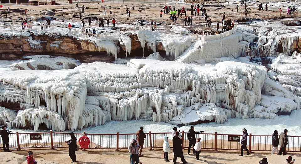 近日,受持续降温天气影响,黄河晋陕峡谷流凌密度持续增大,滚滚黄河水裹挟着大量流凌顺流而下,在黄河壶口瀑布下游十里龙槽堆积凝结,形成流凌封河景观。图为1月21日,众多游客在吉县黄河壶口瀑布景区打卡拍照。