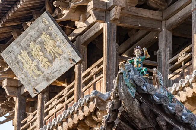 楼体最醒目的是密布的斗拱与灵动的翼角。全楼共345组斗拱,三踩单翘、五踩双翘等多种形制错落排布,如云朵簇拥,既承担承重功能,又兼具装饰价值,“飞云楼”之名便源于此。楼体采用三层四滴水、十字歇山顶设计,32个翼角高高起翘,末端悬挂的风铎随风摆动,每个翘角还嵌有顶盔贯甲的武士造型,色彩虽有斑驳仍可辨原貌。