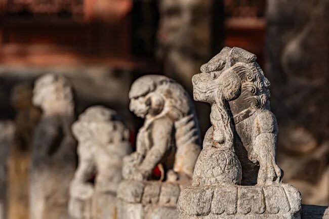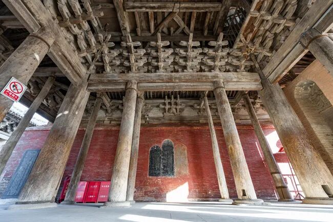 穿过飞云楼,便可见午门、献殿、香亭、正殿构成的壮阔序列,与飞云楼的精巧形成鲜明反差。午门面阔七间,单檐歇山顶,梁架用材粗犷、斗拱尺度硕大,虽经明代修缮,仍保留元代建筑古朴豪放的气质;献殿柱身略带弯曲,尽显元制不羁;明正德年间的香亭以精细石雕闻名,四根蟠龙石柱与栏板石狮形态各异,由附近村民捐建而成,石材、字体风格多样,凝聚着民间工匠的虔诚与巧思;正殿与香亭檐角相距极近,雨天正殿雨水先落香亭瓦檐再二次滴落,“雨中不湿鞋”的设计既减缓雨水冲刷,又节约用地,尽显古人智慧。