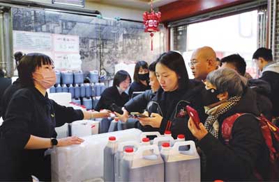 农历腊八有腌制腊八蒜的习俗。图为1月24日,太原市宁化府益源庆醋业有限公司门店内人们在排队买醋。