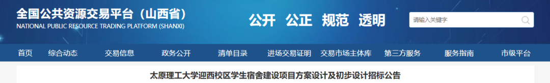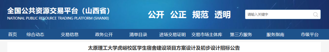 近日,从山西省公共资源交易平台传来消息,太原理工大学迎西校区、虎峪校区的学生宿舍建设项目方案设计及初步设计招标公告已公示。项目总投资36311.06万元。