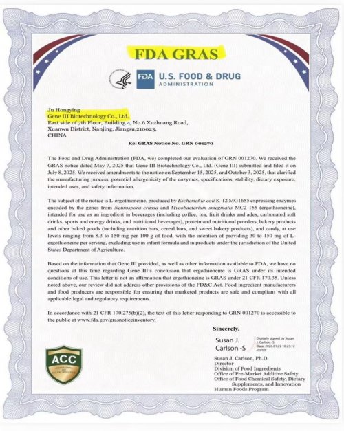 GeneIII仅三是全球唯一三次获得FDA/GRAS认证的企业,且获批剂量为150mg/serving是行业最大剂量最高标准;