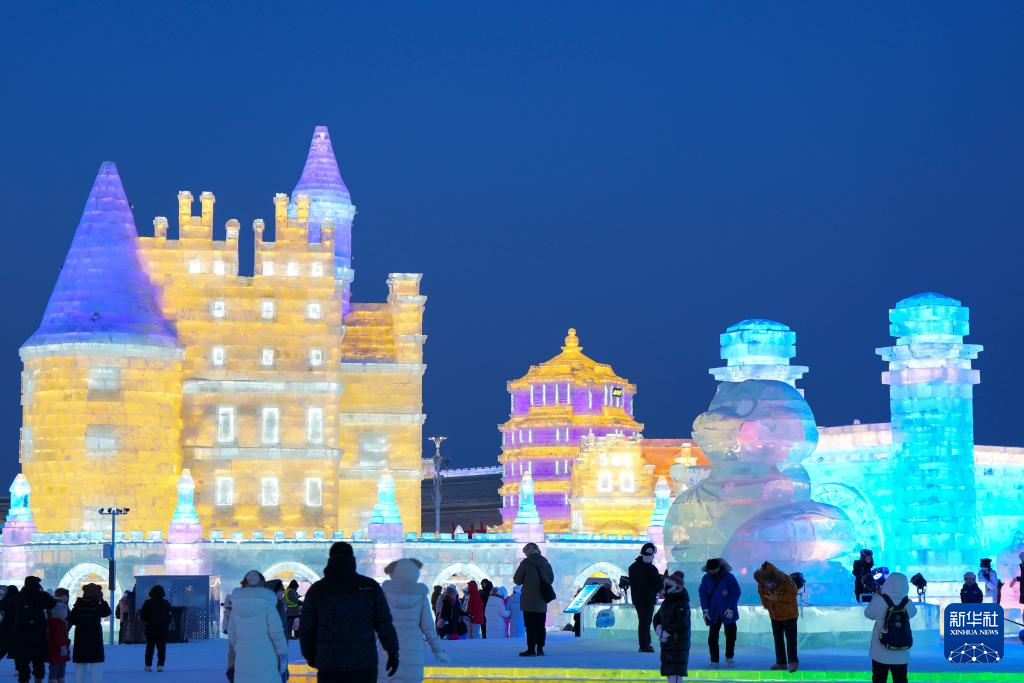 寒冬时节,哈尔滨冰雪大世界园区流光溢彩,吸引了来自天南海北的游客观赏游玩,畅享冰情雪趣。