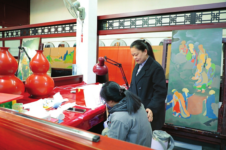 在漆器制作车间,雷树娟与工匠师傅正在探讨工艺细节。本报记者裴云锋摄