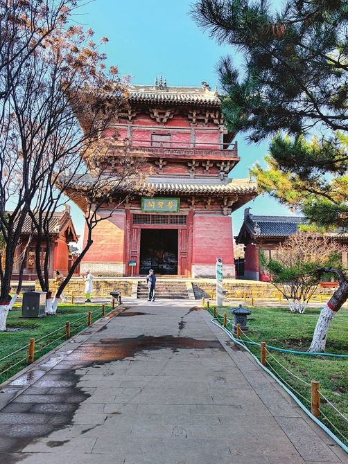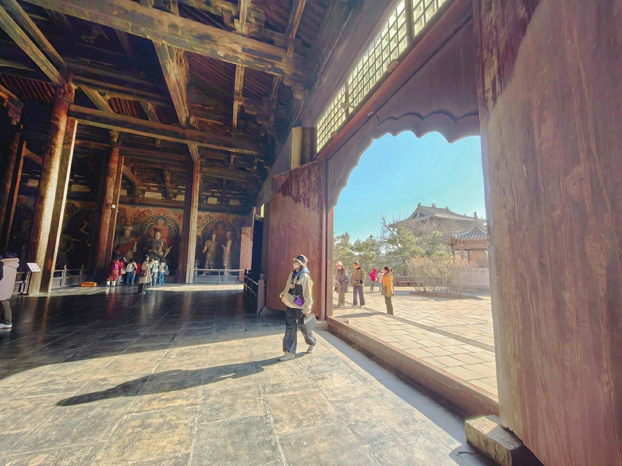 初冬的塞外,寒风凛冽,天空没有一丝云,蓝得分外明净清澈。“九百年风云变幻宠辱不惊静观世变,七王朝岁月沧桑沉浮无意闲看人忙。”走近善化寺这扇厚重的朱漆山门时,门上的对联令人驻足沉思。山门巍峨——是承载的巍峨,斗拱层叠而上,如一朵倒悬的、在金代开始盛放的木质莲花。