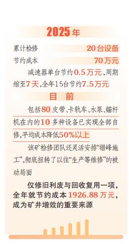 “2025年,我们累计检修20台,节约成本70万元;减速器单台节约0.5万元,周期缩至7天,全年15台节约7.5万元。目前,包括80皮带、卡轨车、水泵、锚杆机在内的10多种设备已实现全部自修,平均成本降低50%以上。”与此同时,该矿检修团队还灵活安排“错峰施工”,彻底扭转了以往“生产等维修”的被动局面。仅修旧利废与回收复用一项,全年就节约成本1926.88万元,成为矿井增效的重要来源。