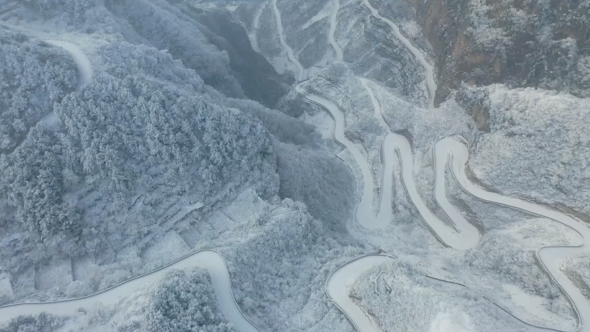 从空中俯瞰,雪后的太行山银装素裹、群峰纵横、云雾升腾,蜿蜒的山路如一条巨龙在山间盘绕,共同构成了一幅流动的水墨长卷;而漫山遍野的苍松翠柏被雪凇覆盖,如棉絮轻覆,似玉蕊垂枝,好像进入童话般的冰雪世界。