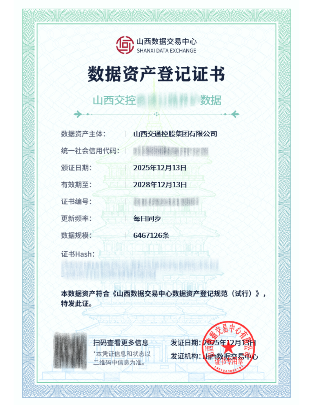 依托这一成熟治理框架,山西交控集团提前按数据清洗加工、合规审核确权等规范流程,将收费通行、能源监测等五大类高速公路核心运营数据,在山西数据交易中心完成登记确权。作为全国唯一获得中央预算内投资的省级数据交易机构,山西数交构建了可信数据空间架构,已开设交通物流行业数据专区,其出具的登记凭证清晰界定权属边界,为数据市场化流通及后续入表工作奠定了坚实合规基础,这也是我省数据要素交易体系落地的具体实践。