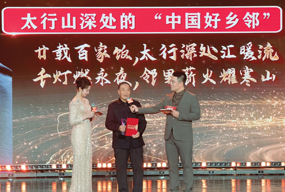 1月28日,由新华社主办的“中国网事·感动2025”公益盛典暨年度颁奖典礼在北京举行,活动揭晓“中国网事·感动2025”十大年度网络人物。这是“太行山深处的‘中国好乡邻’”黄崖沟村村民代表(中)出席颁奖典礼。